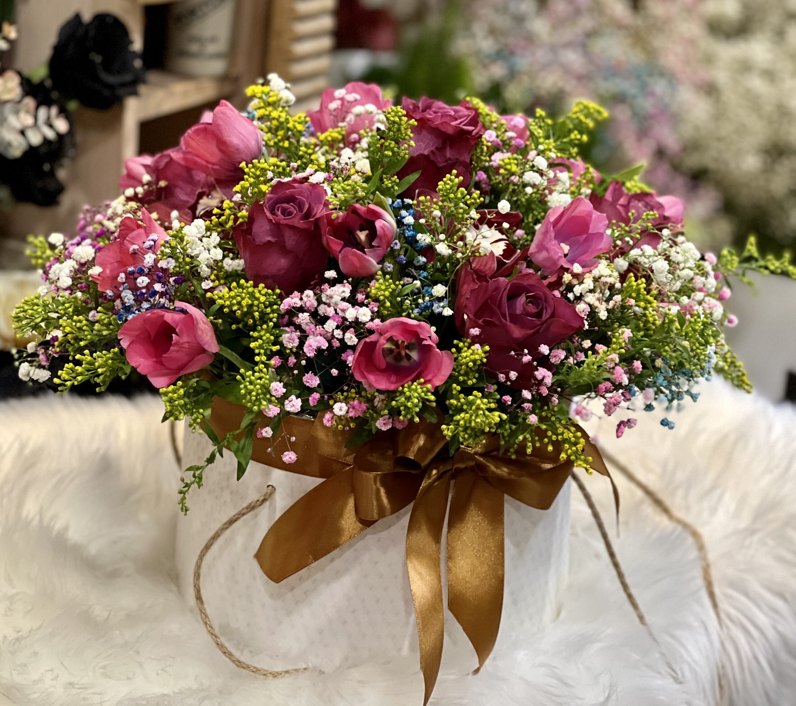 Puokštę sudaro ypatingų spalvų gėlės; tulpės, rožės, eustoma, rykštenis ir kiti derantys priedai.