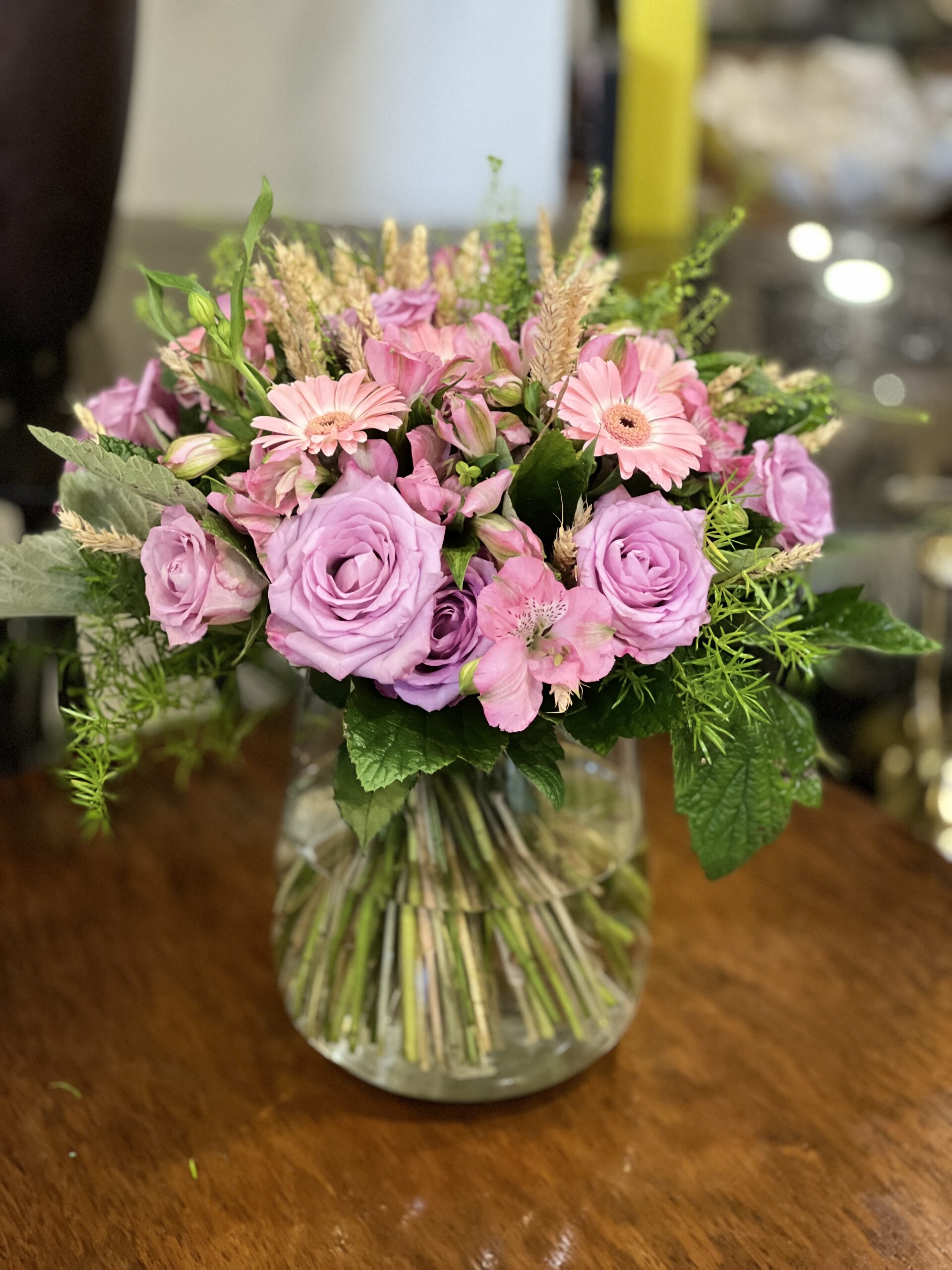 Puokštė surišta iš švelnių alyvinių spalvų gėlių. Eustoma, rožė, alstramerija, javų varpos, deranti žaluma. Puokštė pateikta be spalvoto įpakavimo.