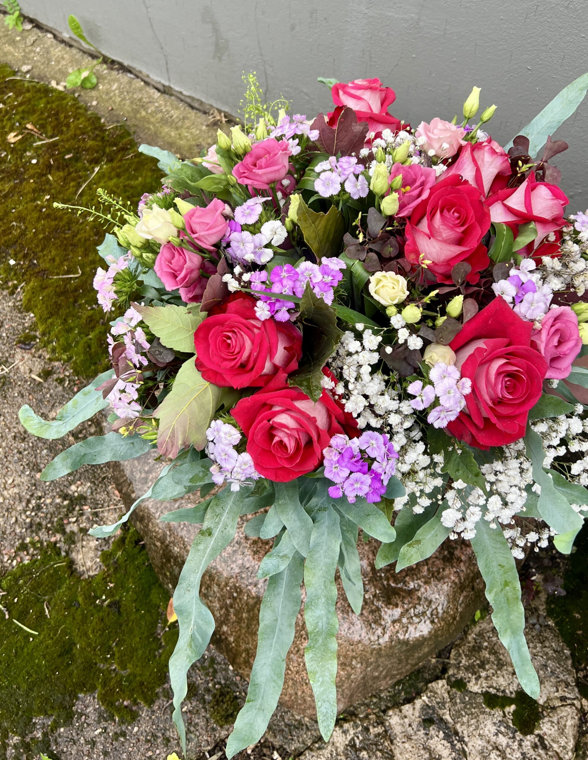 Puokštę sudaro dvieju spalvų rožės, liaukonija, guboja, eustoma, sidabriškos atspalvio egzotiniai lapai. Puokštė rišta rankoje. Įpakavimas pagal kliento pageidavimą.
