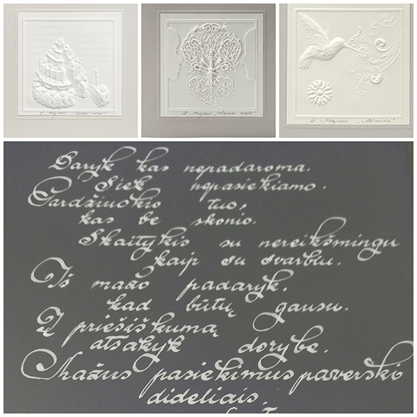 Lietuvoje pagamintas reljiefinės grafikos atvirukas 15cm x 15cm ir dailyraščiu užrašytas Jūsų pasirinktas tekstas.